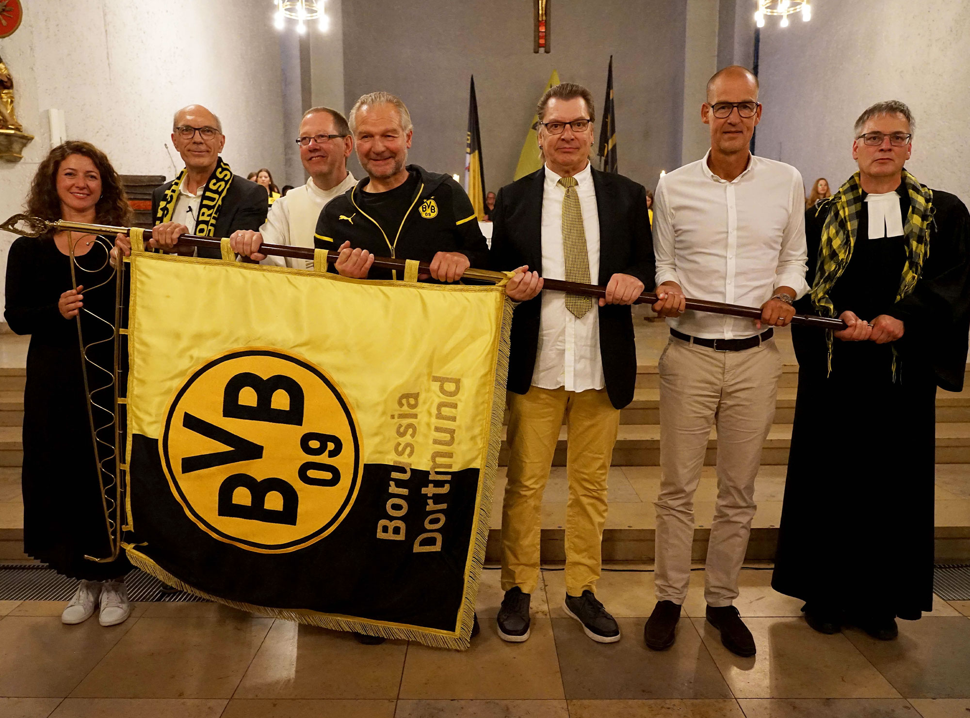 Übergabe der Jubiläumsfahne im Gottesdienst (v.l.): Maike Vollmer (Stiftung „Leuchte auf“), Kay Bandermann, Karsten Haug, Teddy de Beer (Fanbeauftragter und ehemaliger Torwart), Michael Werminghaus (BVB-Fanclub Herz des Nordens), Carsten Cramer (BVB-Geschäftsführer) und der evangelische Pfarrer Rüdiger Holthoff. Foto: Michael Bodin / Erzbistum Paderborn