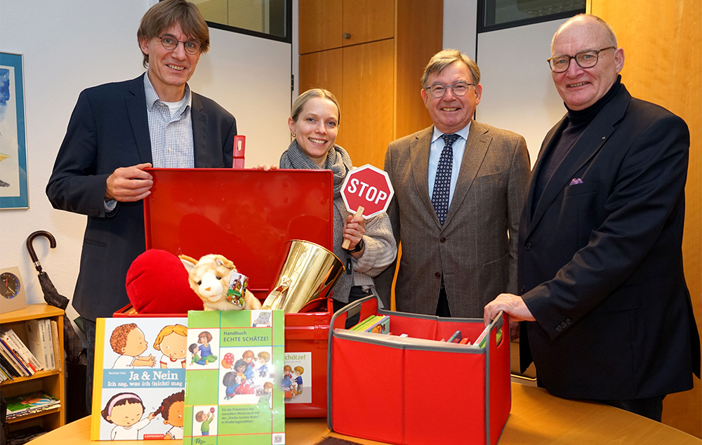 Eine STARKE KINDER KISTE! für pädagogische Arbeit zur Prävention sexualisierter Gewalt kann die Erziehungsberatungsstelle des Sozialdienstes katholischer Frauen Dortmund Mitte (SkF) künftig interessierten Kitas zur Verfügung stellen. Möglich wurde dies auch durch eine großzügige Spende der Marianne Hoffmann-Stiftung für die sich der Hilfsfonds „Dortmunder Kinder in Not“ herzliche bedankte (v.l.): Alwin Buddenkotte (Katholische Soziale Dienste), Inga Zschaage (Erziehungsberatungsstelle), Dr. Gert Fischer (Marianne Hoffmann-Stiftung) und Propst Andreas Coersmeier. Foto: Michael Bodin / Kath. Pressestelle Dortmund