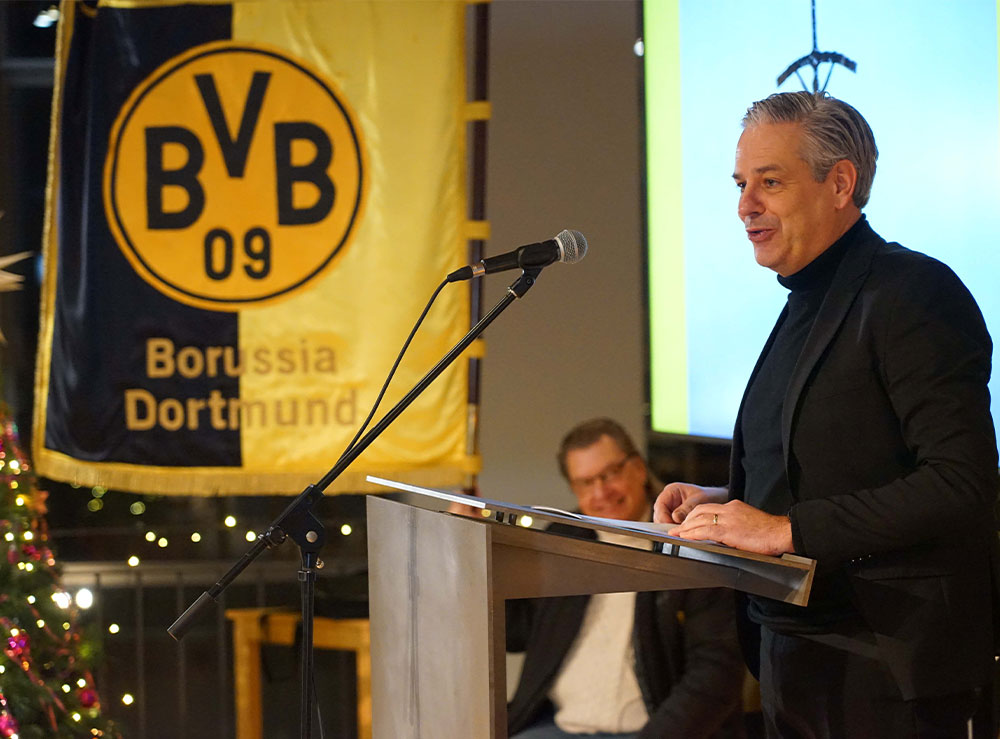 Manuel Neukirchner, Direktor des Deutschen Fußballmuseums, hielt am Donnerstag die Predigt im ökumenischen Gottesdienst zum 115. Geburtstag des BVB im Studio41 in Dortmund. Foto: Michael Bodin / Erzbistum Paderborn