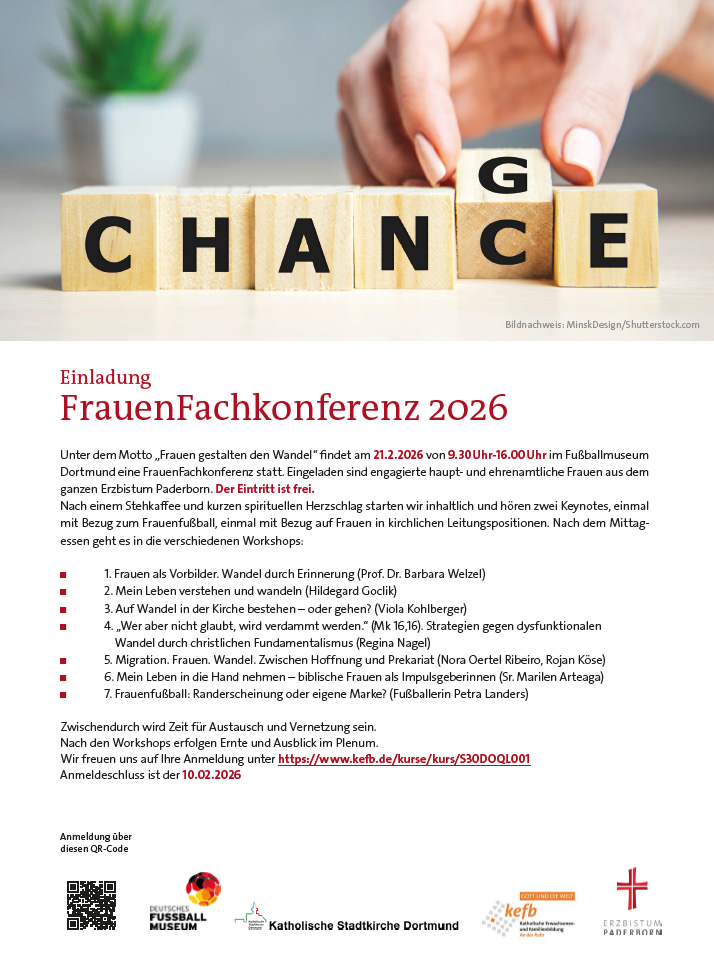 Unter dem Motto „Frauen gestalten den Wandel“ findet am Samstag, 21. Februar 2026, von 9.30 bis 16.00 Uhr die FrauenFachkonferenz 2026 im Deutschen Fußballmuseum Dortmund statt. Eingeladen sind engagierte haupt- und ehrenamtliche Frauen aus dem gesamten Erzbistum Paderborn. Der Eintritt ist frei.