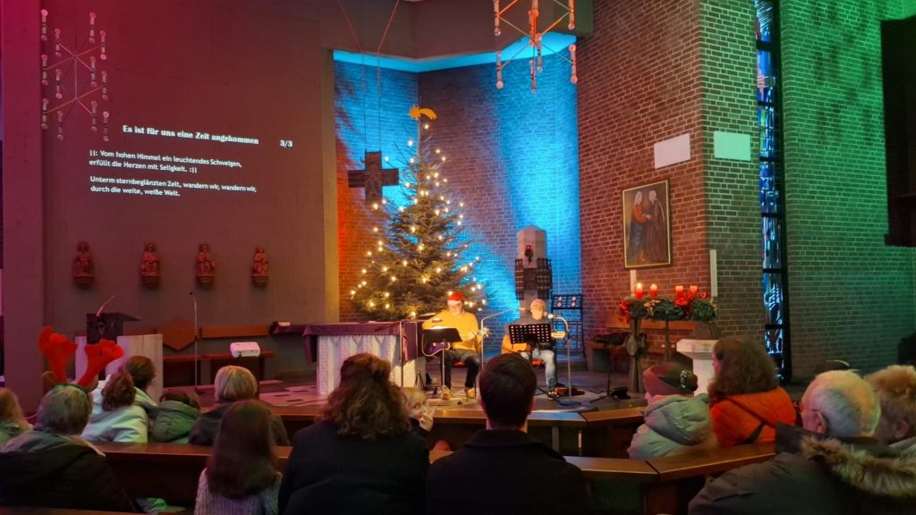 Auf dem Programm standen zunächst Advents- und Winterlieder. Von „Alle Jahre wieder“ bis zu „Leise rieselt der Schnee“ und dem „Winter-Wunderland“, stimmten die Besucherinnen und Besucherkräftig mit ein. So näherte man sich den vorweihnachtlichen Liedern, um schließlich auch das ein oder andere Weihnachtslied einzuüben. Besonders mitreißend war der spontane Kinderchor auf den Altarstufen, als „In der Weihnachtsbäckerei“ angestimmt wurde. Es gab aber auch Phasen mit ruhigeren Liedern, die das Herz für das nahende Weihnachtsfest öffneten.